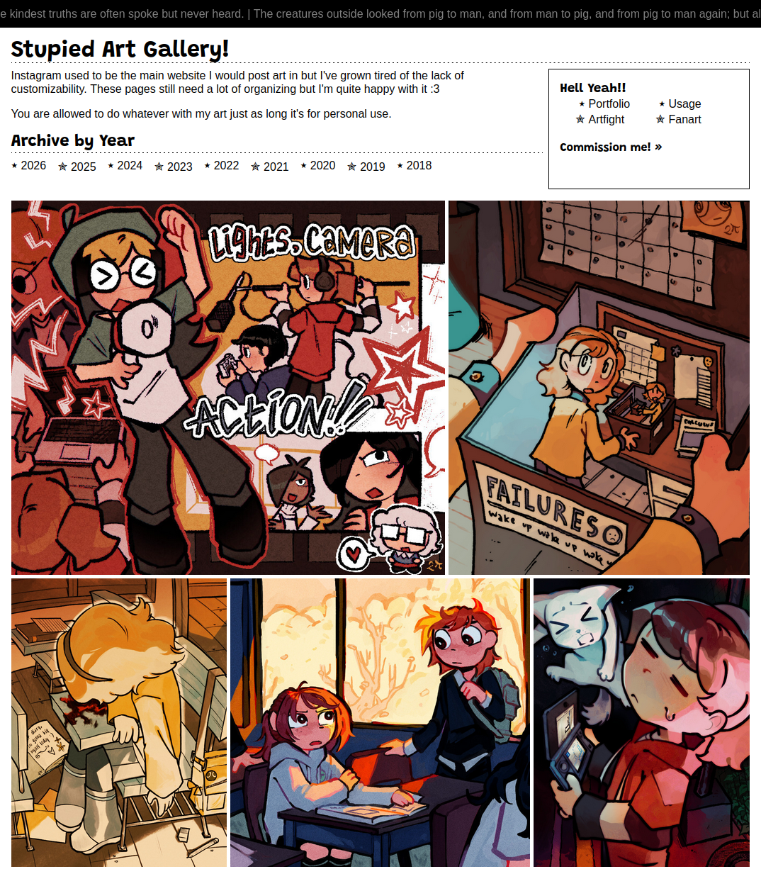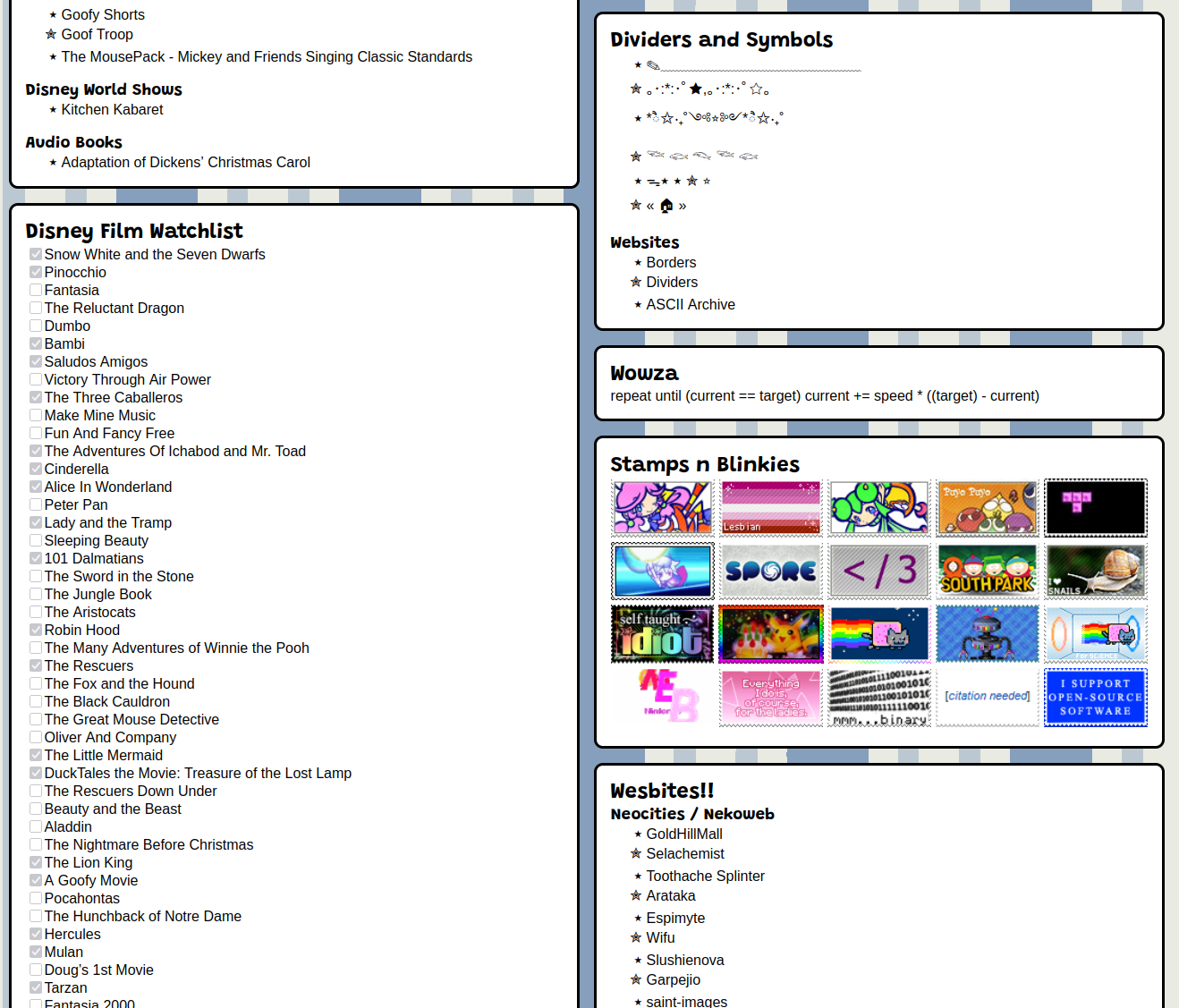 The first page I clicked on was stupied. Exploring her page was just cute. Especially the listography was wonderful, I had to smile and lough a couple times going through this. There was something so refreshing and interesting about her page. It is such a unfiltered raw look into someones mind, I cannot help it but just find it mesmerizing. The disney watchlist with checkboxes, the 100 questions to an artist, the “Neat Sounding Words” list. It is all just SO cute.